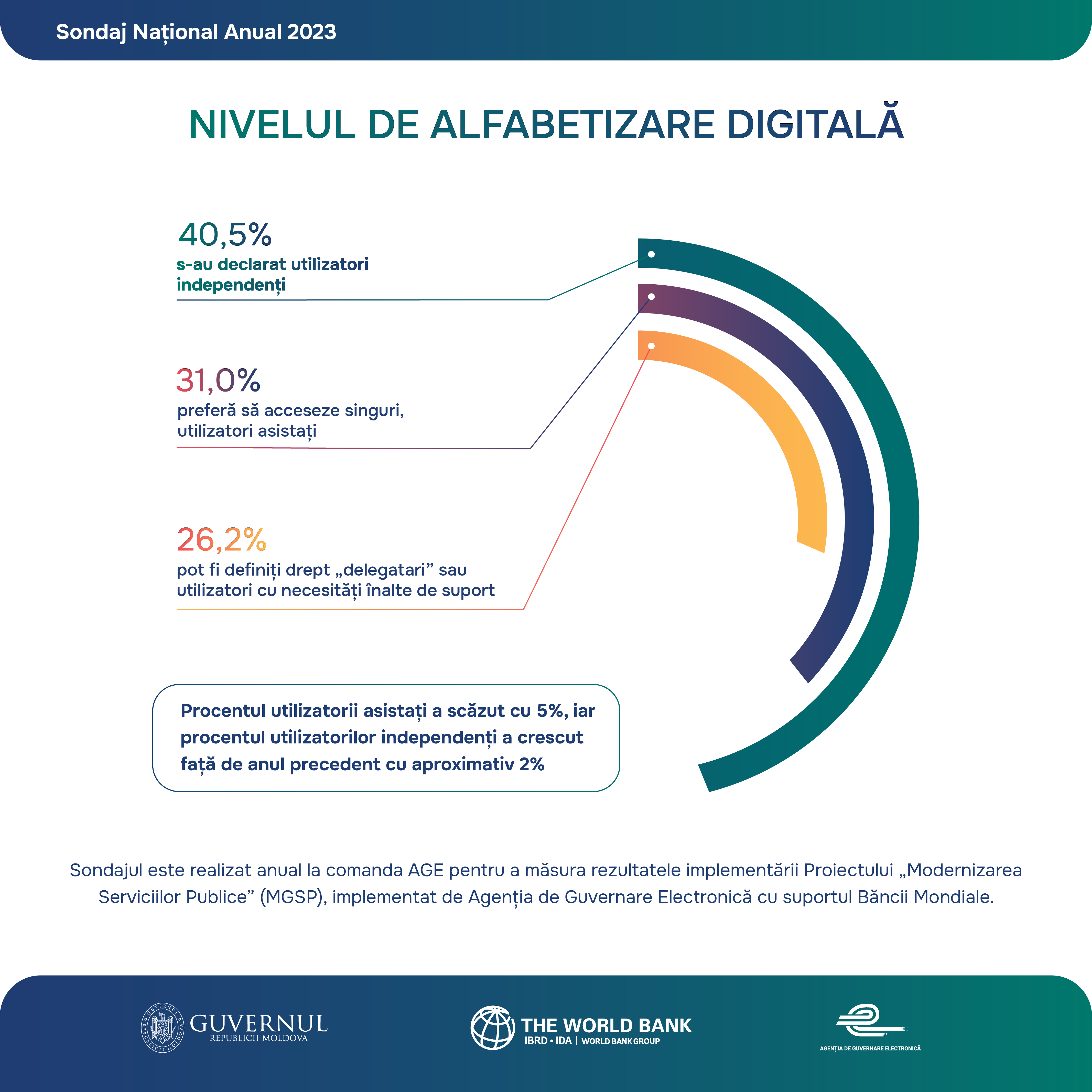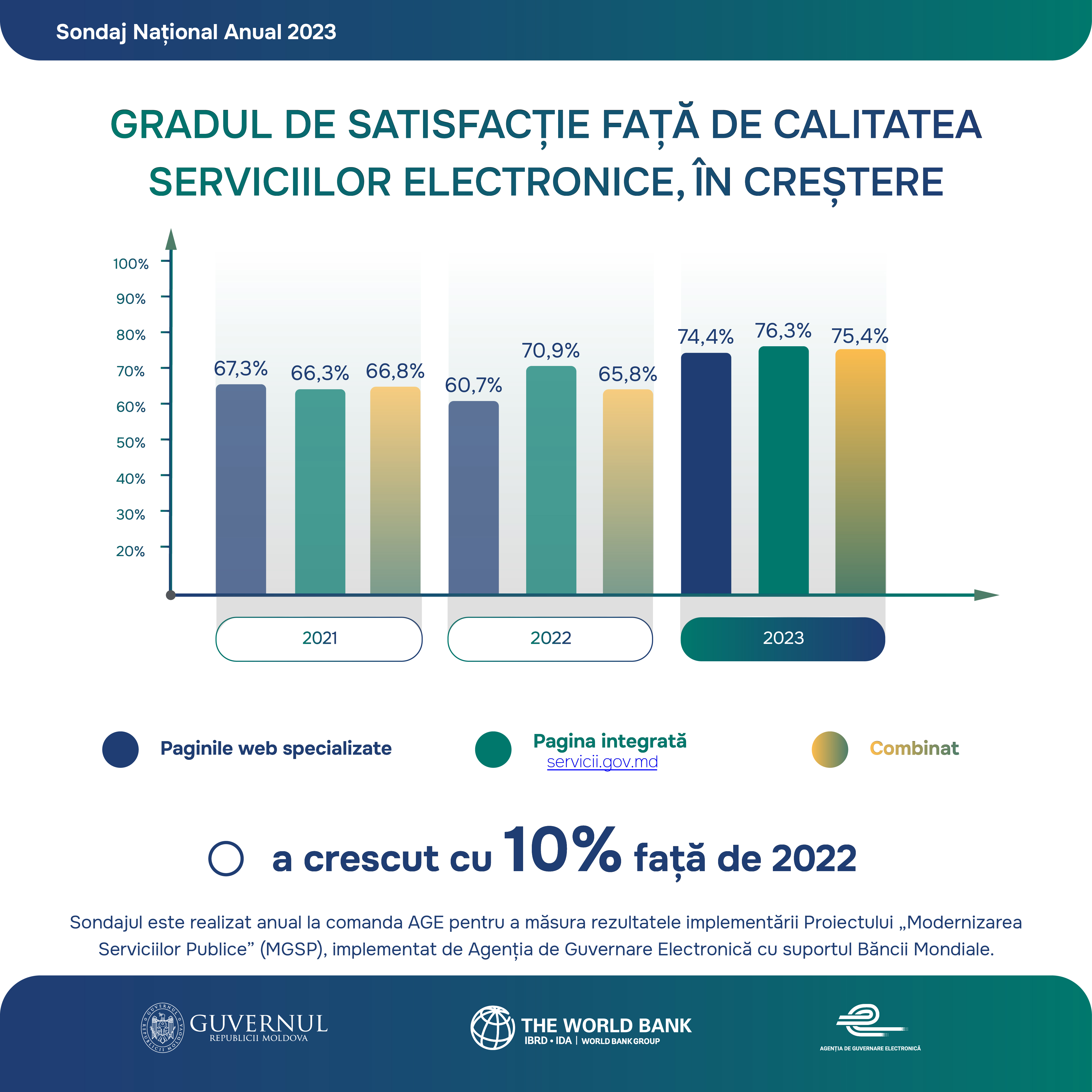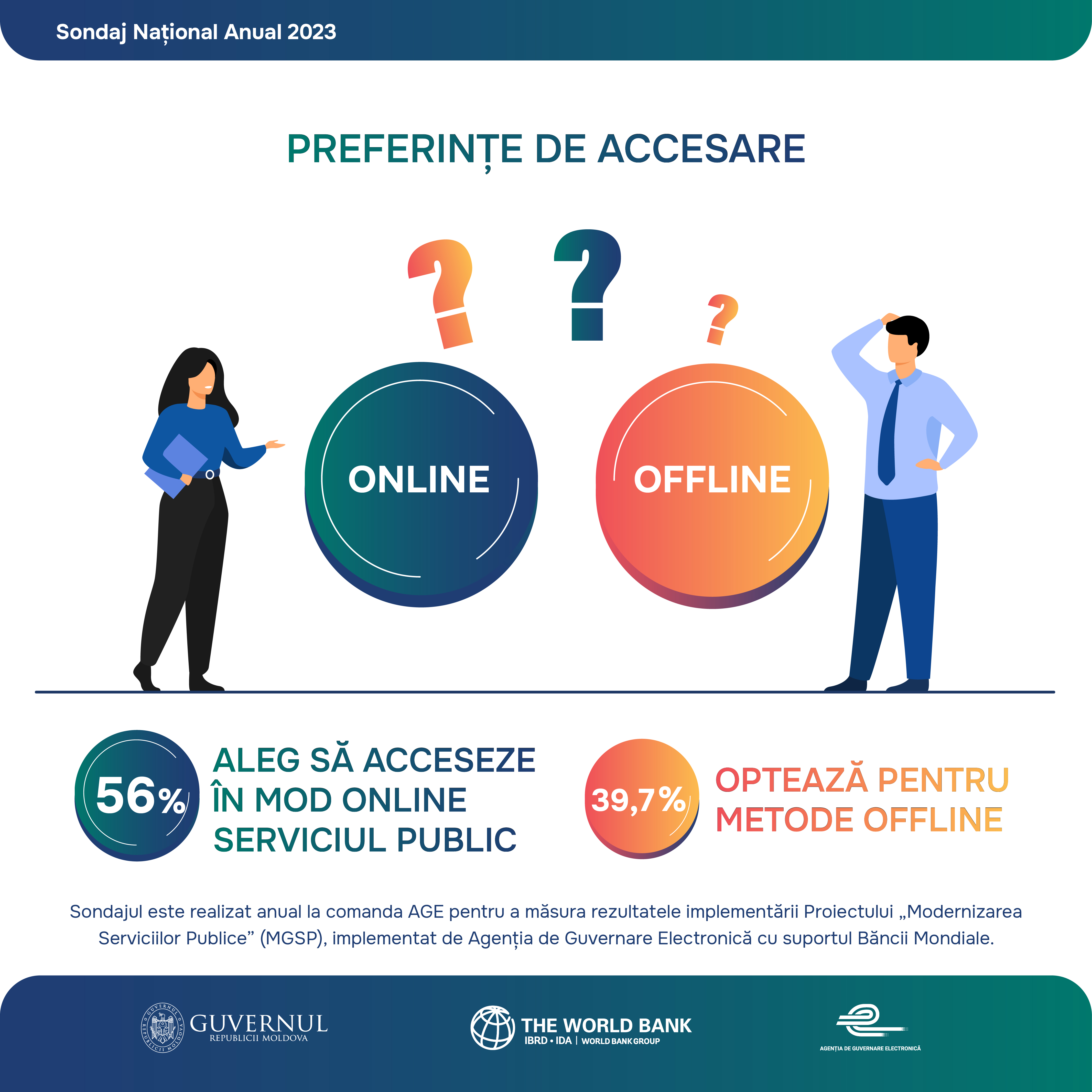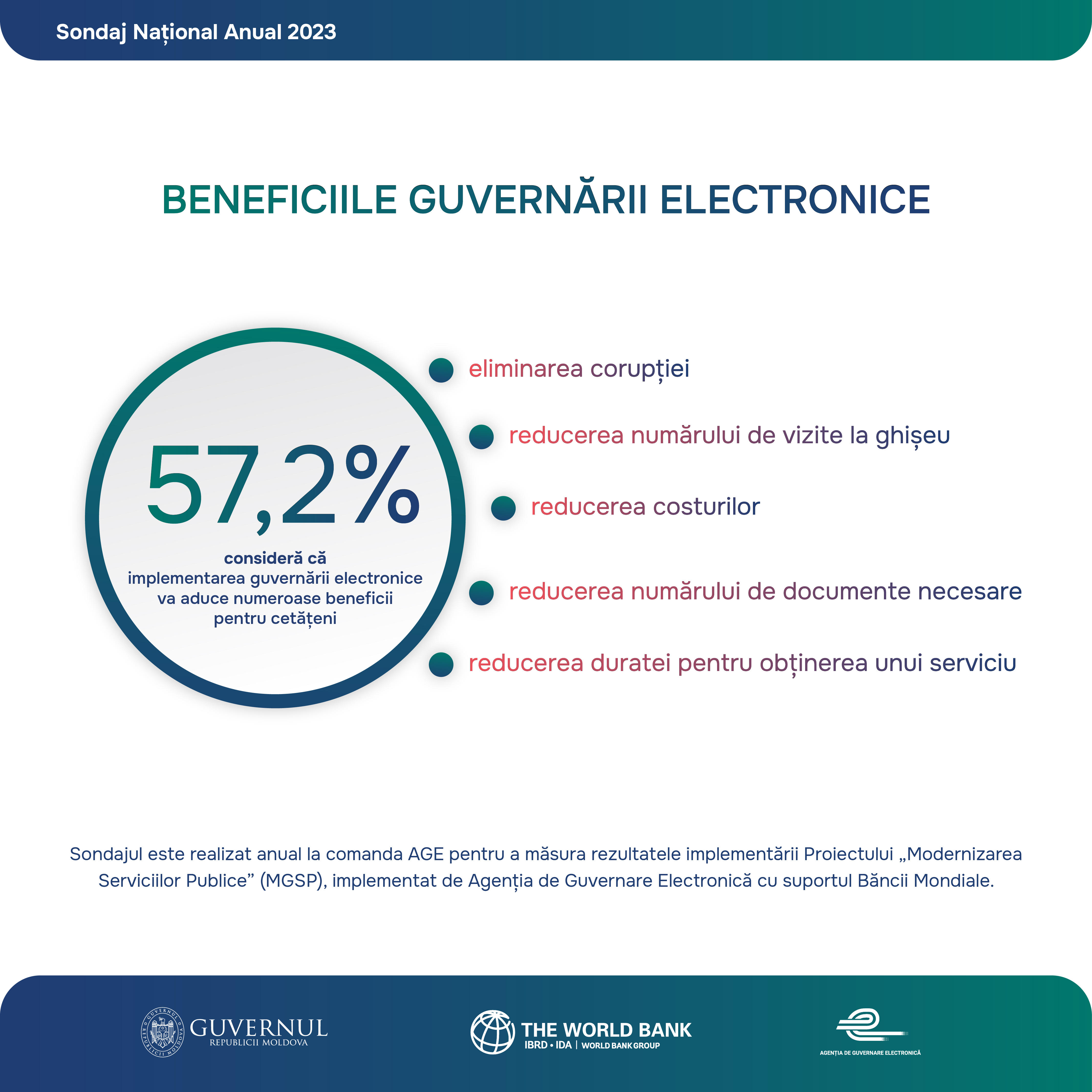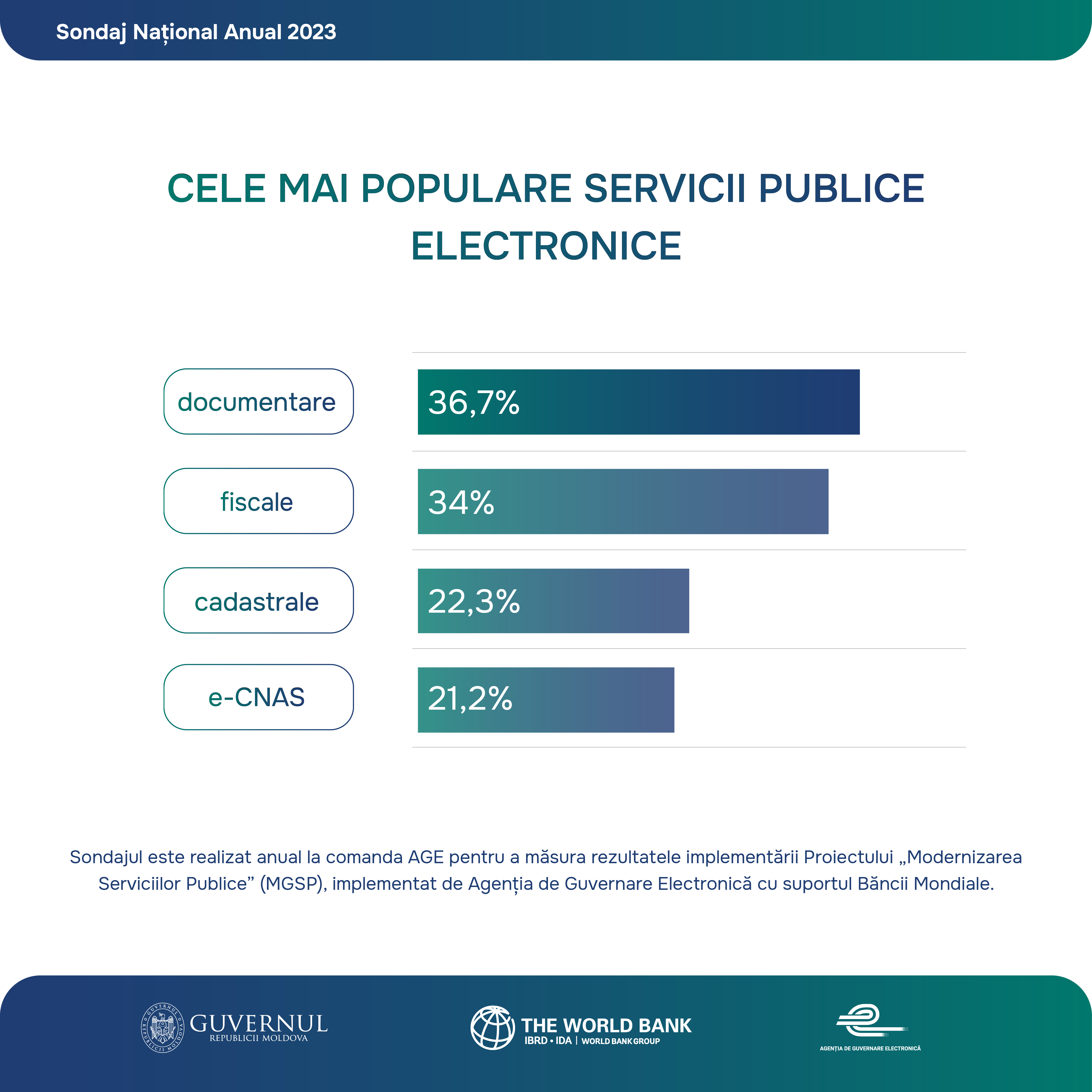 Sondaj Național Anual 2023 privind Percepția, asimilarea și susținerea de către populație a e-Guvernării și Modernizării serviciilor guvernamentale, realizat în cadrul Proiectului „Modernizarea Serviciilor Guvernamentale în Republica Moldova”, implementat de Agenția de Guvernare Electronică, cu suportul Grupului Banca Mondială.