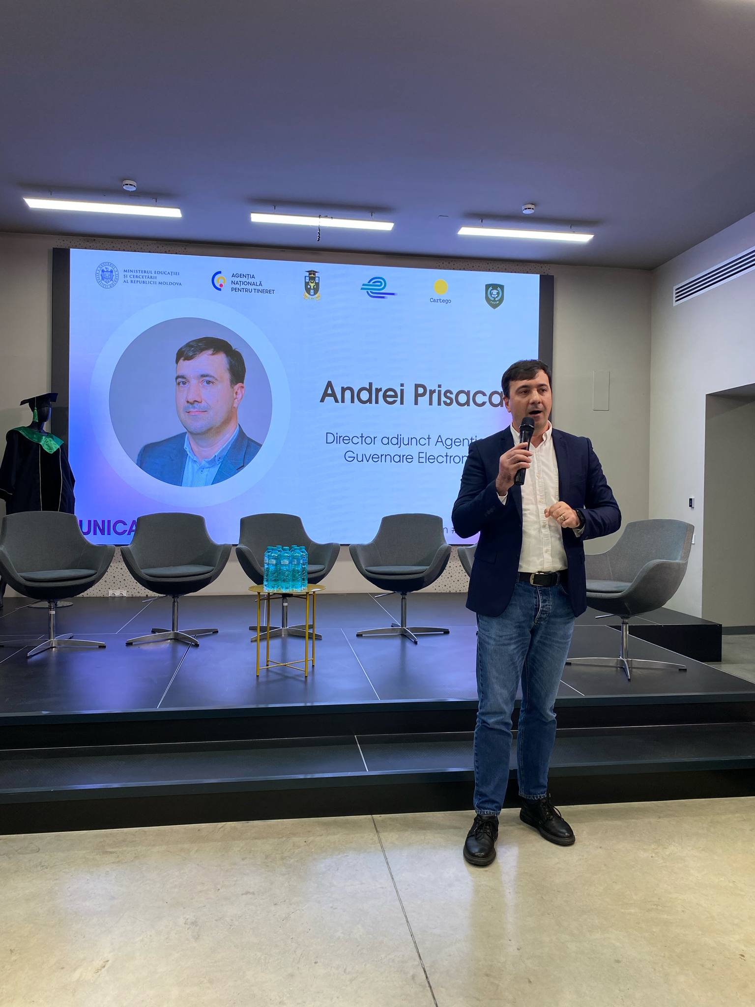 Andrei Prisacar, director adjunct AGE, a vorbit despre realizările și prioritățile Guvernului în domeniul transformării digitale: „Ecosistemul digital al Republicii Moldova se dezvoltă inclusiv datorită tinerilor care aleg să rămână acasă, să studieze aici și să contribuie la transformarea digitală a statului. Universitățile noastre sunt capabile să formeze specialiști de forță, bine pregătiți în cadrul unor programe avansate, tineri creativi și bine pregătiți, alături de care noi reușim să construim viitorul unei societăți avansate din punct de vedere digital”.