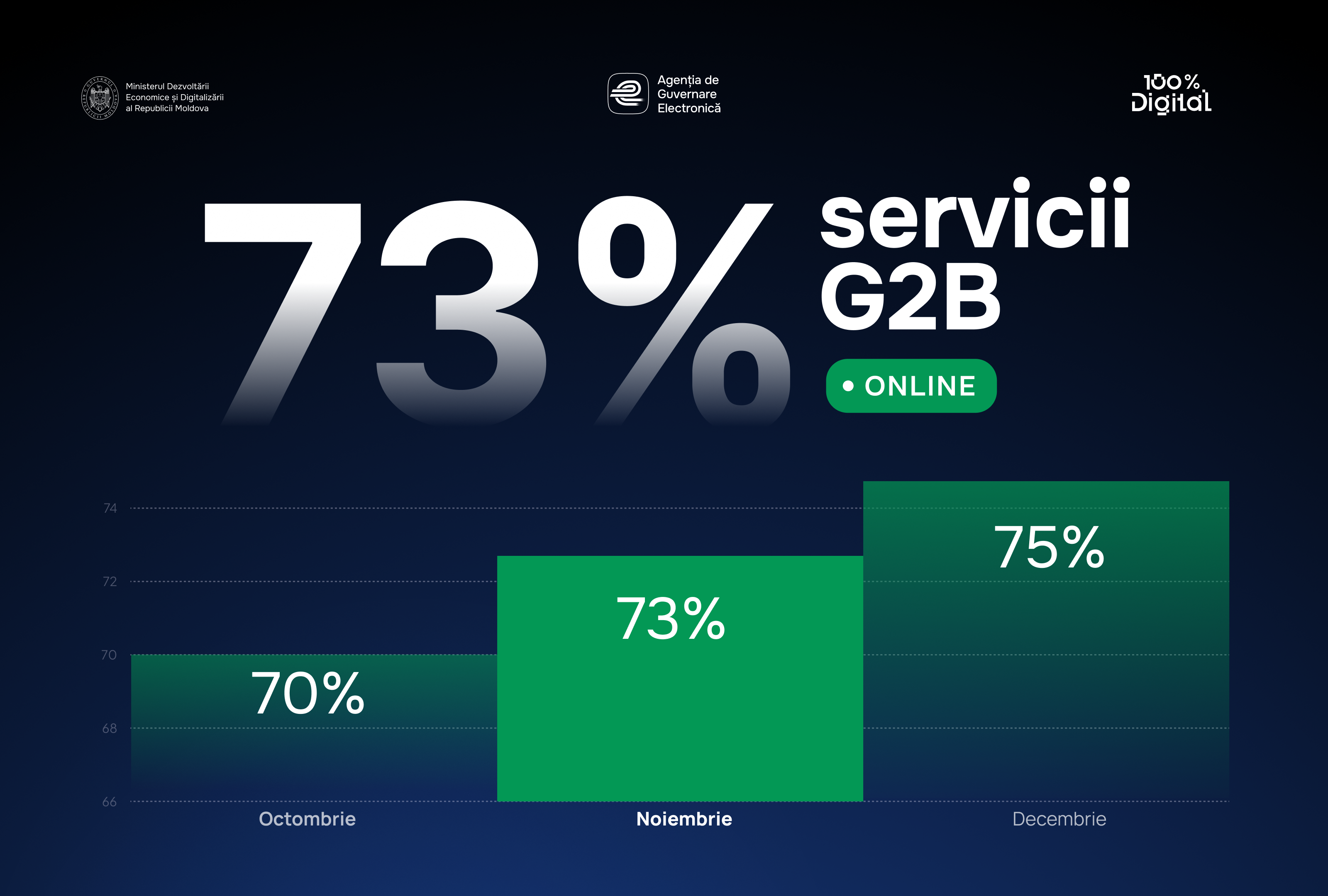 În iunie 2025, am început cu 60% dintre serviciile G2B disponibile online. În doar câteva luni, am digitalizat 37 de servicii noi pentru antreprenori. Ne mai rămân doar 9 servicii de digitalizat pentru a ajunge la obiectivul de 75% digital, setat până la finele anului.