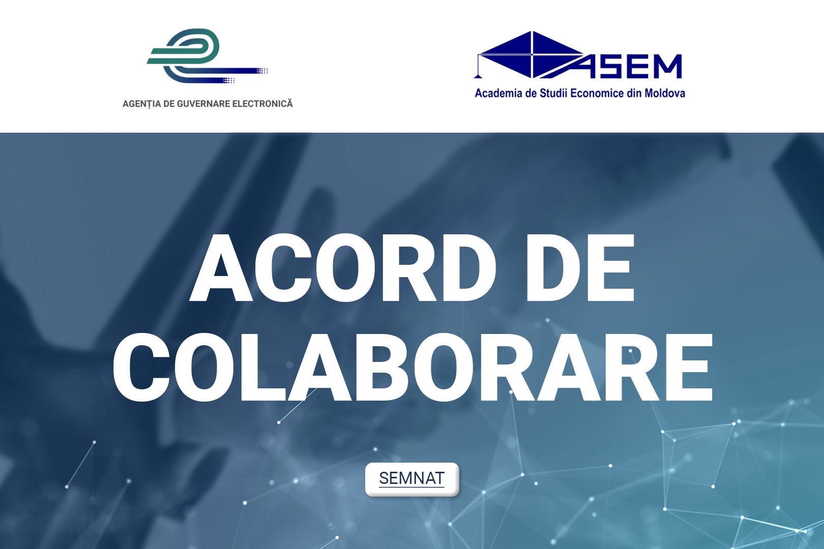 Соглашение о сотрудничестве между Агентством электронного управления (АЭУ) и Академией экономических наук Молдовы (АЭНМ) было подписано в электронном виде между двумя сторонами, в лице Андрея Присэкар, директора АЭУ, и Александру Стратан, ректора АЭНМ.