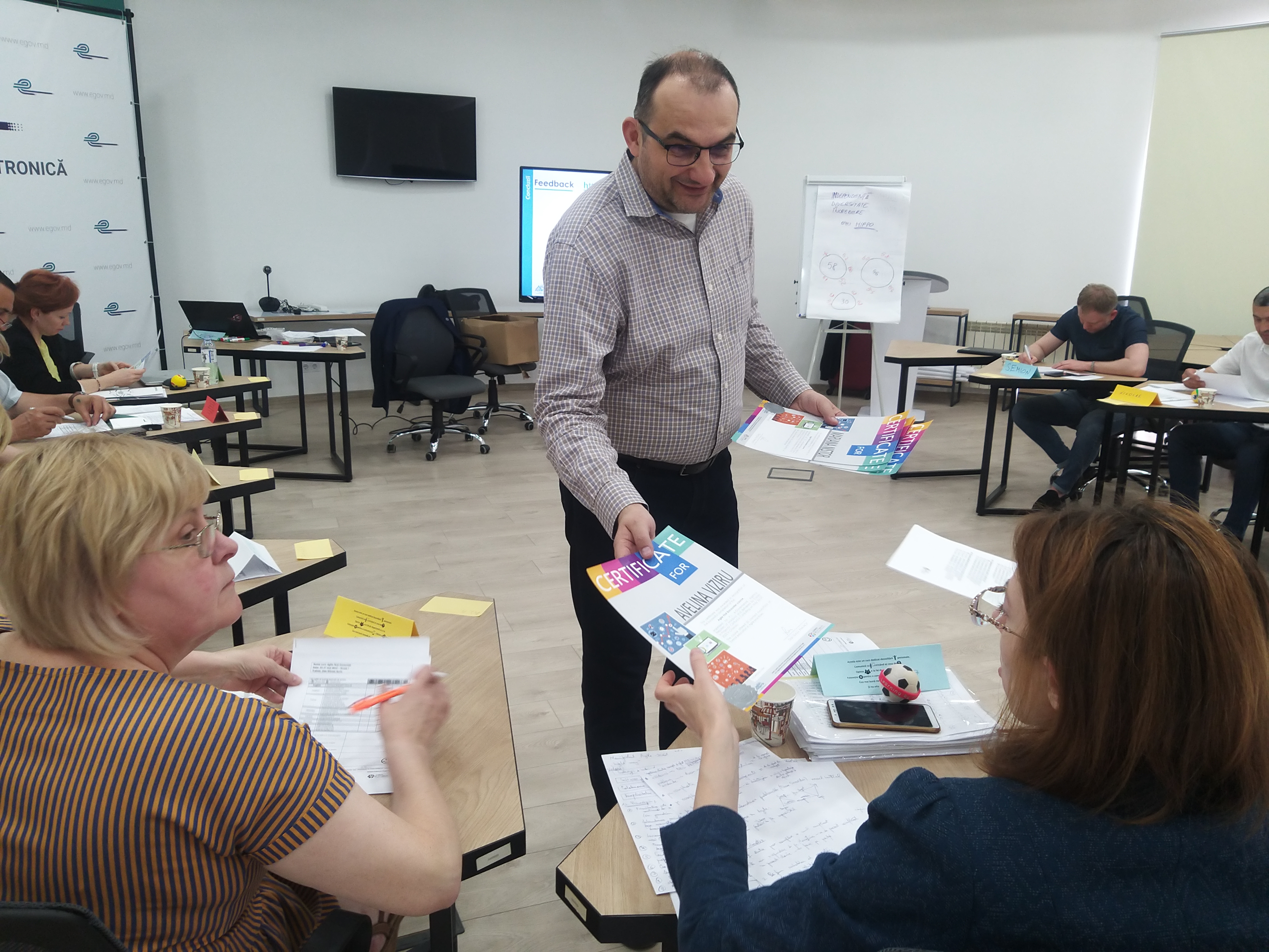 În perioada 23 - 27 mai curent, Agenția de Guvernare Electronică (AGE) a organizat prima etapă a Instruirii în practicile de lucru AGILE pentru angajații instituțiilor prestatoare de servicii: Agenția Servicii Publice (ASP) și Casa Națională de Asigurări Sociale (CNAS), precum și pentru specialiști din cadrul AGE. La cursul de instruire au participat funcționari de nivel managerial, desemnați pentru dezvoltarea Sistemelor Informaționale „Protecția Socială” (SIPS), Acte de Stare Civilă (SI ASC) și Registrul de Stat al Unităților de Drept (RSUD) care vor fi implementate în activitatea de prestare a serviciilor publice. Acestea vor fi dezvoltate în baza metodologiei AGILE – o abordare agilă pentru a obține valoare reală și rezultate rapide pe parcursul implementării proiectelor de reinginerie și digitalizare.