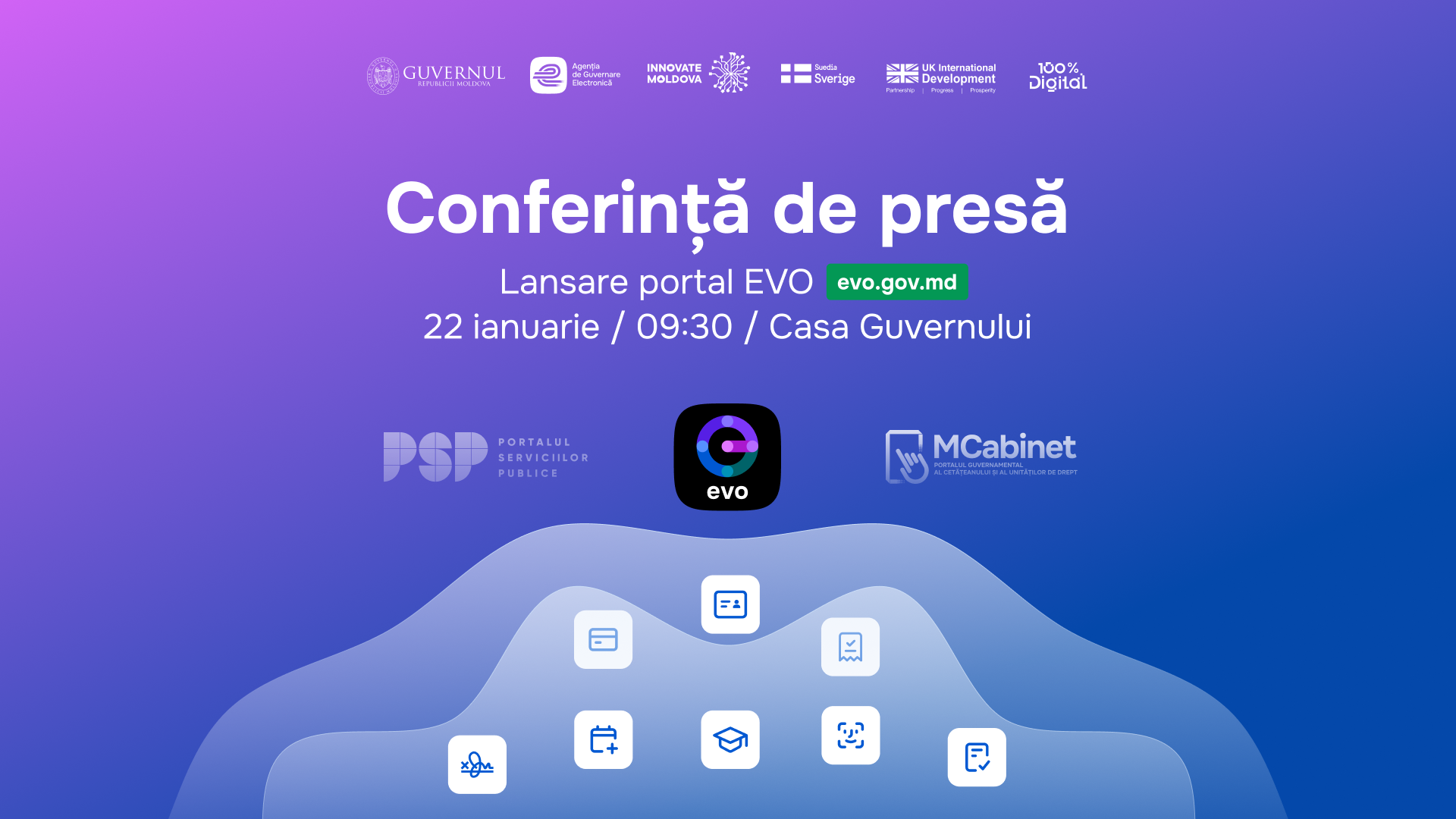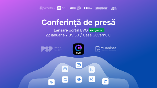 Agenția de Guvernare Electronică vă invită la conferința de presă pentru lansarea Portalului guvernamental integrat EVO – evo.gov.md, un singur nume, un singur link, un singur punct de acces.