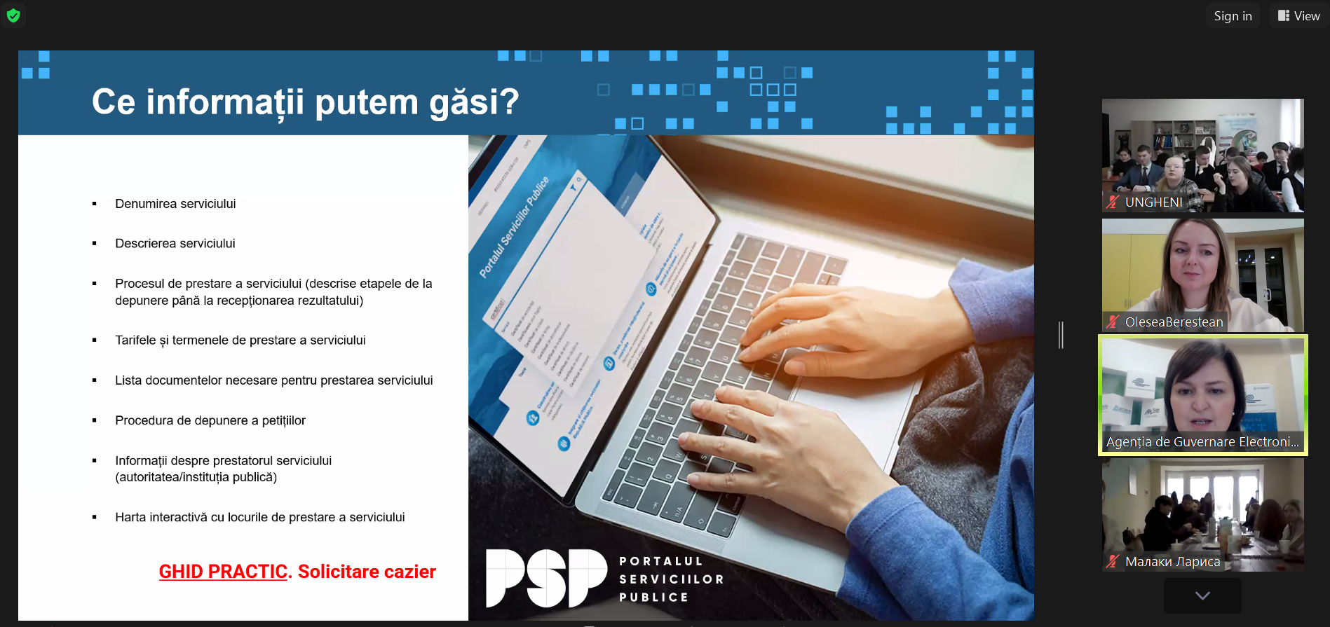 Молодые волонтеры - члены проекта HelpAge International Moldova, партнера Агентства электронного управления, с которым мы уже несколько лет успешно сотрудничаем в области цифровой интеграции и поддержки пожилых людей. В ходе вебинара были продемонстрированы практические упражнения по доступу к цифровым платформам, показаны видеоролики и предоставлены в распоряжение участников основные информационные ресурсы, способствующие обучению и адаптации к новым цифровым технологиям.